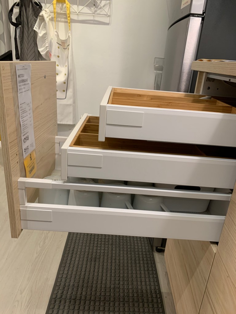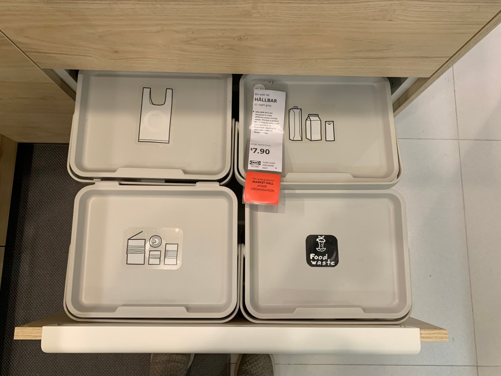I’m spatially challenged and can’t think in inches or centimetres or the preferred unit of measurement – millimetres! So I’ve taken to carrying a measuring tape everywhere I go. If my interior designer says, “The drawer is 500”, I immediately whip out the tape and show myself what 500mm looks like before I make a decision. For the longest time I thought drawer of 13cm height was super narrow, but actually it’s quite a lovely height for a kitchen or bathroom drawer. To get a better idea of kitchen drawers and cool features, I spent almost an entire day in IKEA, armed with clipboard, draft kitchen layouts, and my tape. I went from kitchen to kitchen, opening and closing drawers, measuring width and height and depth, getting a feel for dimensions and drawer design, and checking drawer inserts, soft closing mechanism, hinges, accessories (some pictures shown below). Waste bins are a particular interest of mine since I separate wet and dry garbage, and separate recycling items. My interior designer probably thinks I’m crazy for the number of waste bins I’m planning. My husband definitely thinks so. I don’t really care, I believe we must reduce, reuse, and recycle.